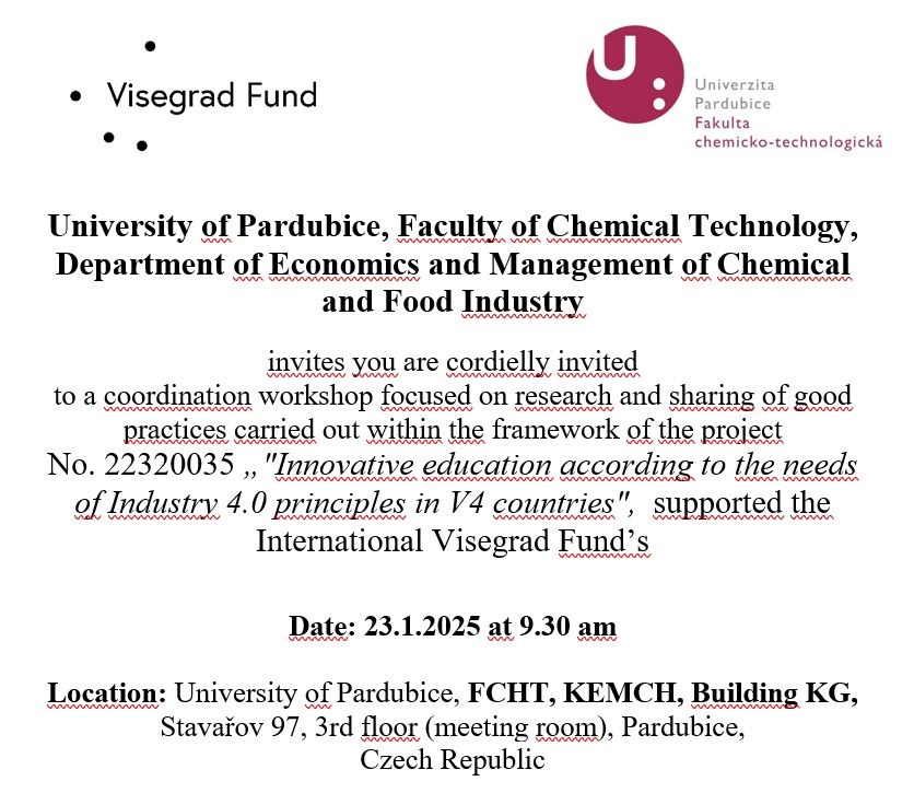 Dne 13.2.2024 zveme naše kolegy a další zájemce na iniciační workshop, kde budou představeny cíle projektu, participující účastníci a postup roací na projektu s výhledem k roku 2025, kdy má být projekt ukončen. Akce se uskuteční od 11h v prostorách KEMCh (Budova KG, Stavařov 97, 3. np (zasedací místnost), Pardubice)
