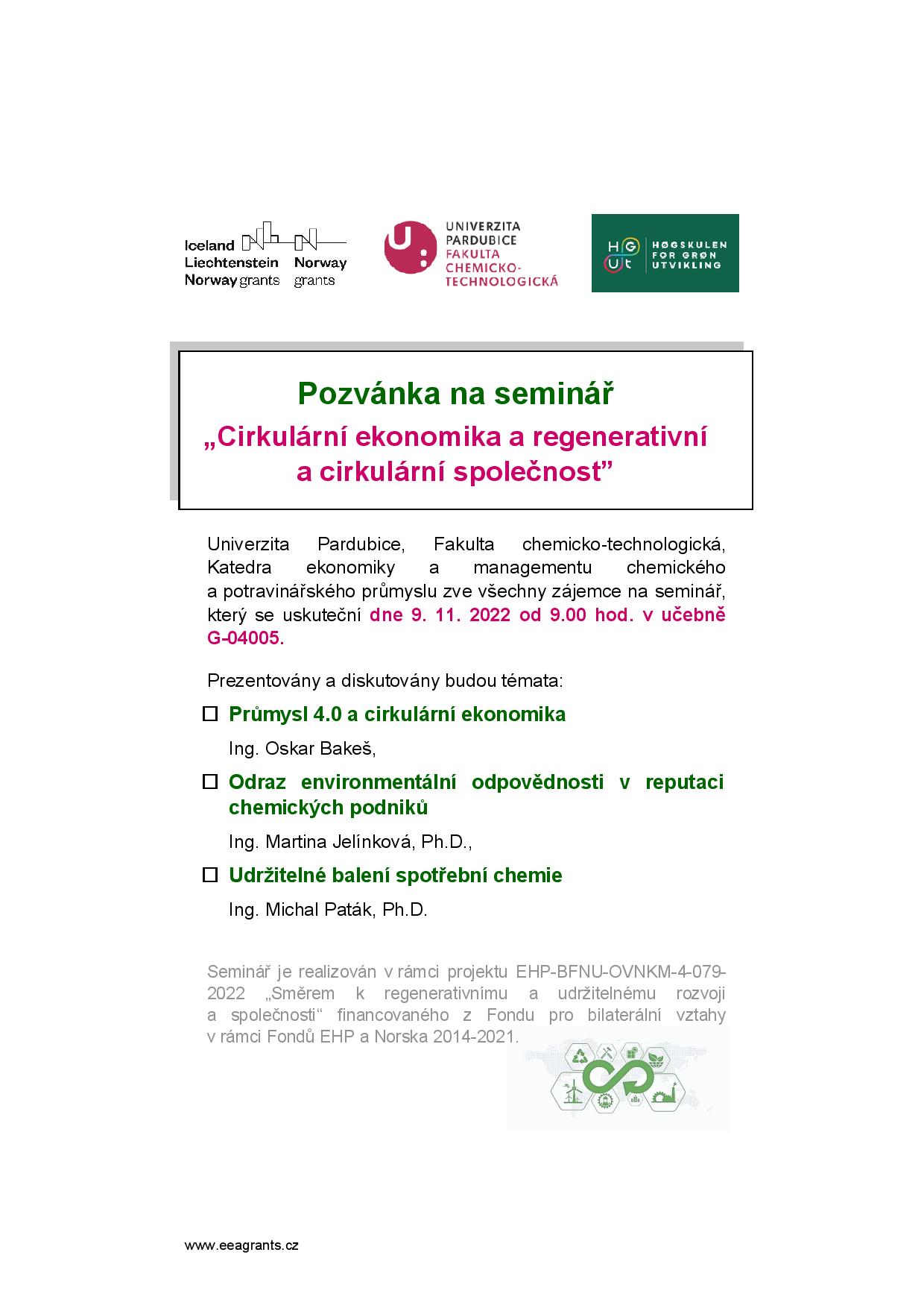 - Seminář “Circular economy and regenerative and circular society”. Prezentovány a diskutovány budou témata „Průmysl 4.0 a cirkulární ekonomika“, „Udržitelné balení spotřební chemie“, „Odraz environmentální odpovědnosti v reputaci chemických podniků“. (9.11.2022 v 9.00 hod., Univerzita Pardubice, FCHT, učebna G-04005)