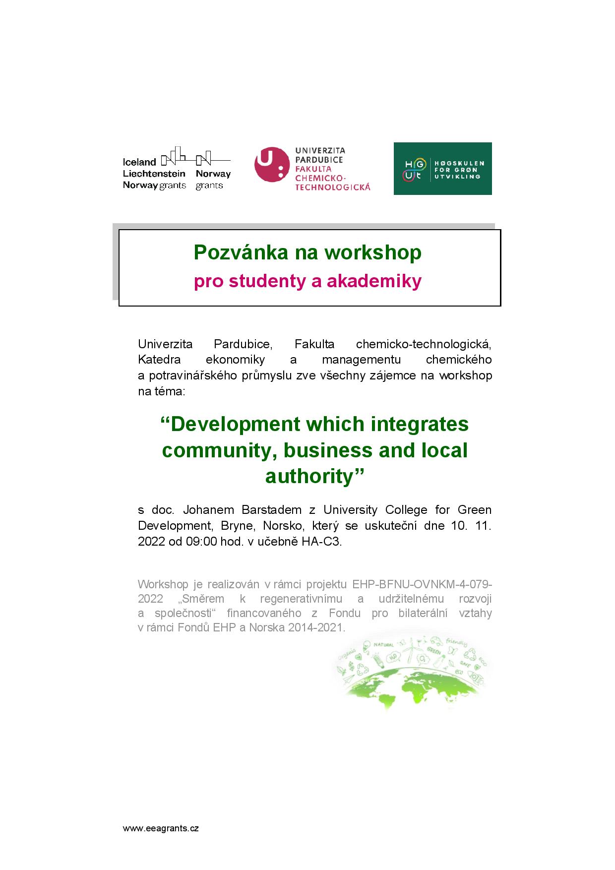 - Workshop se studenty a akademiky na téma “Development which integrates community, business and local authority” – přednášející doc. Johan Barstad z Høgskulen for Grøn Utvikling, Bryne, Norsko (10. 11. 2022 v 9.00 hod., Univerzita Pardubice, FCHT, učebna HA-C3)