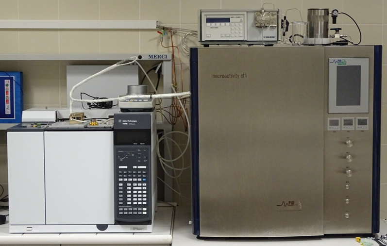 Four flow-through apparatus for testing catalysts and for kinetics studies of heterogeneous catalytic reactions with on-line product analysis (gas chromatographs with FID and TCD detectors), PID microreactor unit, photoreactor unit.